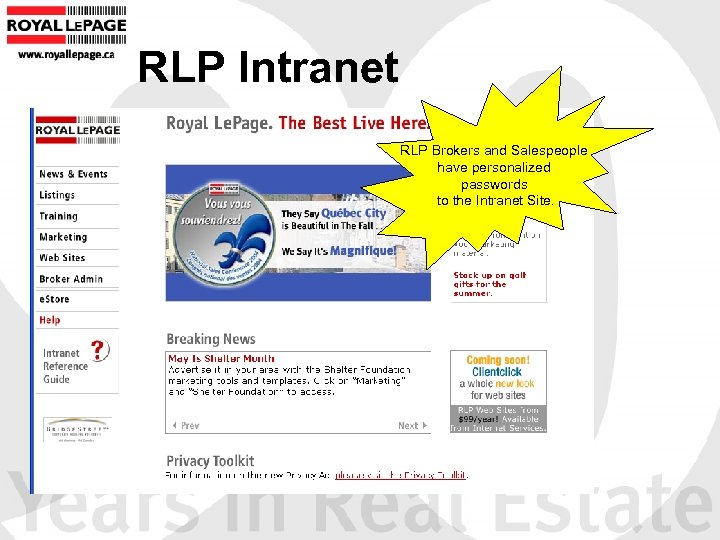 RLP Intranet RLP Brokers and Salespeople have personalized passwords to the Intranet Site.