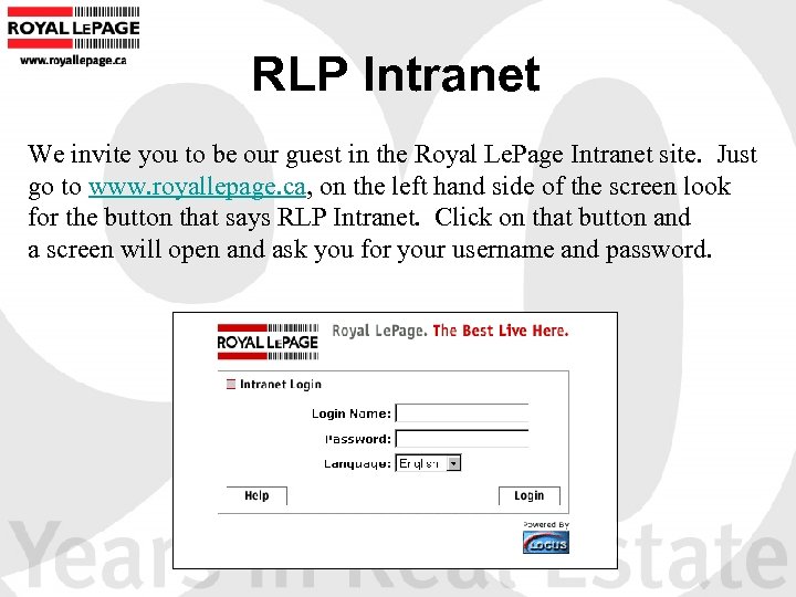 RLP Intranet We invite you to be our guest in the Royal Le. Page Intranet site. Just go to www. royallepage. ca, on the left hand side of the screen look for the button that says RLP Intranet. Click on that button and a screen will open and ask you for your username and password.