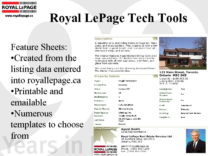 Royal Le. Page Tech Tools Feature Sheets: • Created from the listing data entered into royallepage. ca • Printable and emailable • Numerous templates to choose from