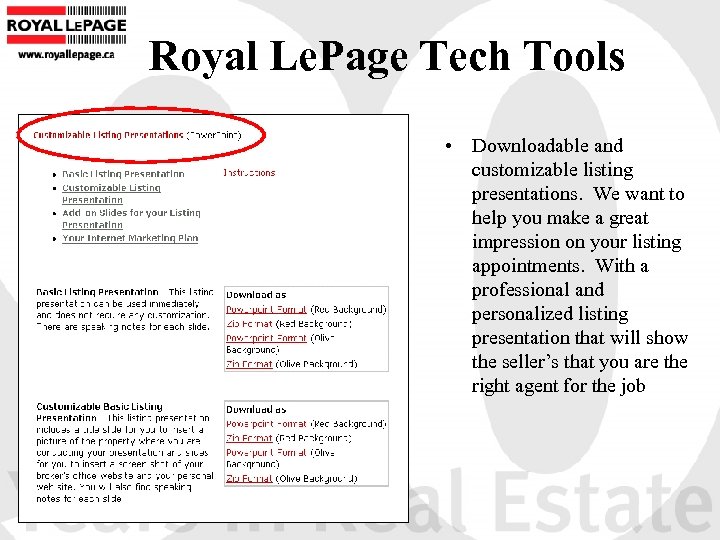 Royal Le. Page Tech Tools • Downloadable and customizable listing presentations. We want to help you make a great impression on your listing appointments. With a professional and personalized listing presentation that will show the seller’s that you are the right agent for the job