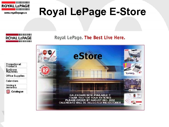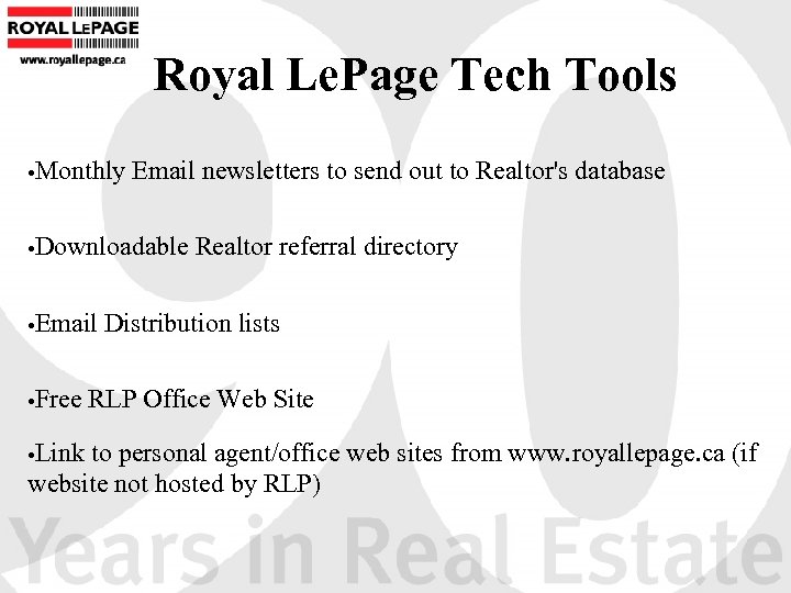 Royal Le. Page Tech Tools • Monthly Email newsletters to send out to Realtor's database • Downloadable Realtor referral directory • Email Distribution lists • Free RLP Office Web Site • Link to personal agent/office web sites from www. royallepage. ca (if website not hosted by RLP)