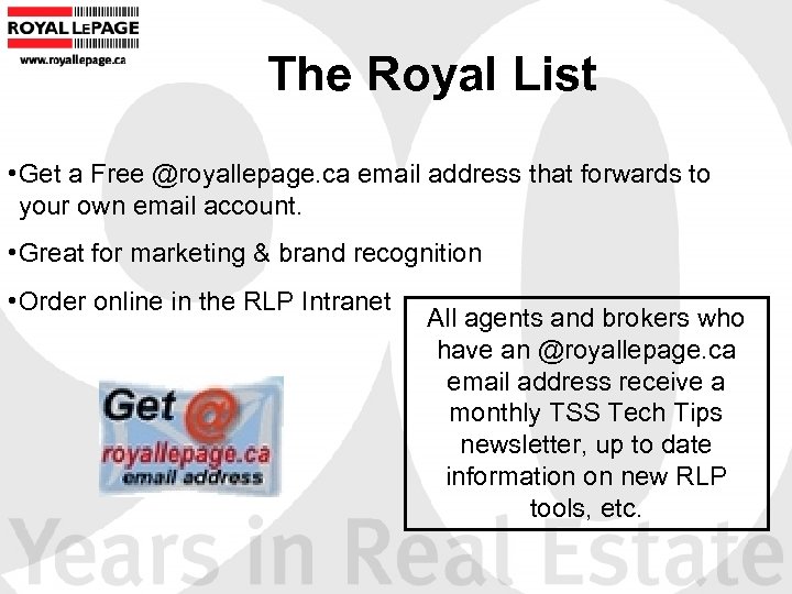 The Royal List • Get a Free @royallepage. ca email address that forwards to your own email account. • Great for marketing & brand recognition • Order online in the RLP Intranet All agents and brokers who have an @royallepage. ca email address receive a monthly TSS Tech Tips newsletter, up to date information on new RLP tools, etc.