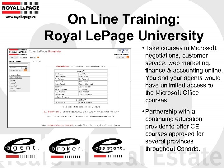 On Line Training: Royal Le. Page University • Take courses in Microsoft, negotiations, customer service, web marketing, finance & accounting online. You and your agents would have unlimited access to the Microsoft Office courses. • Partnership with a continuing education provider to offer CE courses approved for several provinces throughout Canada.