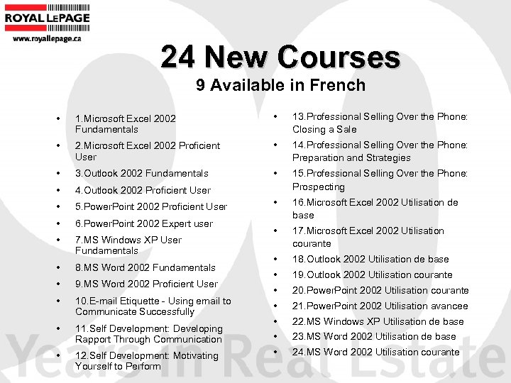 24 New Courses 9 Available in French • 1. Microsoft Excel 2002 Fundamentals • 13. Professional Selling Over the Phone: Closing a Sale • 2. Microsoft Excel 2002 Proficient User • 14. Professional Selling Over the Phone: Preparation and Strategies • 3. Outlook 2002 Fundamentals • • 4. Outlook 2002 Proficient User 15. Professional Selling Over the Phone: Prospecting • 5. Power. Point 2002 Proficient User • • 6. Power. Point 2002 Expert user 16. Microsoft Excel 2002 Utilisation de base • 7. MS Windows XP User Fundamentals • 17. Microsoft Excel 2002 Utilisation courante • 8. MS Word 2002 Fundamentals • 18. Outlook 2002 Utilisation de base • 9. MS Word 2002 Proficient User • 19. Outlook 2002 Utilisation courante • 10. E-mail Etiquette - Using email to Communicate Successfully • 20. Power. Point 2002 Utilisation courante • 21. Power. Point 2002 Utilisation avancee • 11. Self Development: Developing Rapport Through Communication • 22. MS Windows XP Utilisation de base • 23. MS Word 2002 Utilisation de base • 12. Self Development: Motivating Yourself to Perform • 24. MS Word 2002 Utilisation courante
