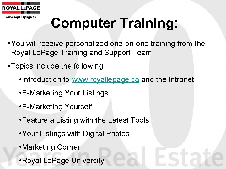 Computer Training: • You will receive personalized one-on-one training from the Royal Le. Page Training and Support Team • Topics include the following: • Introduction to www. royallepage. ca and the Intranet • E-Marketing Your Listings • E-Marketing Yourself • Feature a Listing with the Latest Tools • Your Listings with Digital Photos • Marketing Corner • Royal Le. Page University