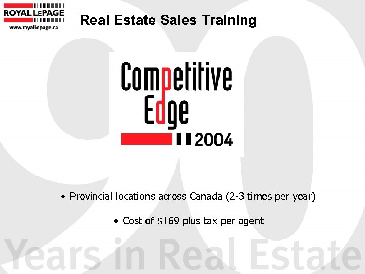 The Competitive Edge 2004 participation will include: • Manual • Certificate of completion • Logo for use on business cards and promotional material • Competitive Edge E-Newsletter • Chance to win a Royal Le. Page Website • 3 Teleconference calls profiling new ideas and best practices • 2004 Class Reunion at the National Sales Conference