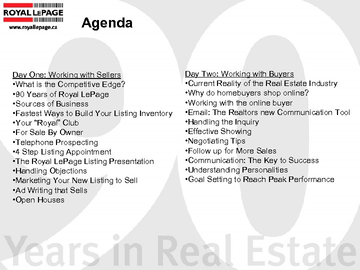 Agenda Day One: Working with Sellers • What is the Competitive Edge? • 90 Years of Royal Le. Page • Sources of Business • Fastest Ways to Build Your Listing Inventory • Your “Royal” Club • For Sale By Owner • Telephone Prospecting • 4 Step Listing Appointment • The Royal Le. Page Listing Presentation • Handling Objections • Marketing Your New Listing to Sell • Ad Writing that Sells • Open Houses Day Two: Working with Buyers • Current Reality of the Real Estate Industry • Why do homebuyers shop online? • Working with the online buyer • Email: The Realtors new Communication Tool • Handling the Inquiry • Effective Showing • Negotiating Tips • Follow up for More Sales • Communication: The Key to Success • Understanding Personalities • Goal Setting to Reach Peak Performance