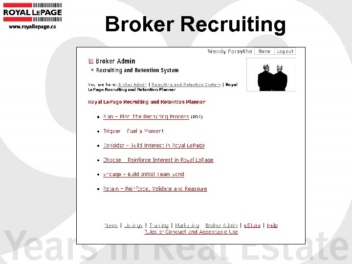 Broker Admin Here's the place to manage your office roster, do your online reporting and use the Royal Le. Page Recruiting and Retention System. You can also find Human Resources information, and how to contact Royal Le. Page Canada.