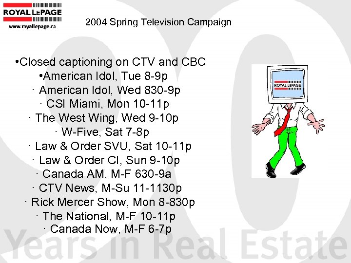 2004 Spring Television Campaign • Closed captioning on CTV and CBC • American Idol, Tue 8 -9 p · American Idol, Wed 830 -9 p · CSI Miami, Mon 10 -11 p · The West Wing, Wed 9 -10 p · W-Five, Sat 7 -8 p · Law & Order SVU, Sat 10 -11 p · Law & Order CI, Sun 9 -10 p · Canada AM, M-F 630 -9 a · CTV News, M-Su 11 -1130 p · Rick Mercer Show, Mon 8 -830 p · The National, M-F 10 -11 p · Canada Now, M-F 6 -7 p