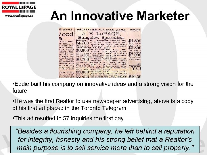An Innovative Marketer • Eddie built his company on innovative ideas and a strong vision for the future • He was the first Realtor to use newspaper advertising, above is a copy of his first ad placed in the Toronto Telegram • This ad resulted in 57 inquiries the first day “Besides a flourishing company, he left behind a reputation for integrity, honesty and his strong belief that a Realtor’s main purpose is to sell service more than to sell property. ”