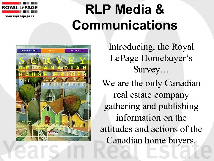 RLP Media & Communications Introducing, the Royal Le. Page Homebuyer’s Survey… We are the only Canadian real estate company gathering and publishing information on the attitudes and actions of the Canadian home buyers.