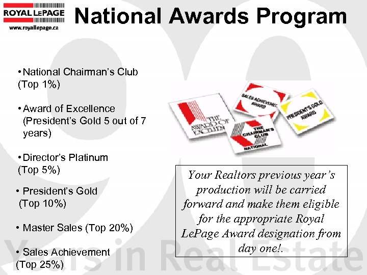 National Awards Program • National Chairman’s Club (Top 1%) • Award of Excellence (President’s Gold 5 out of 7 years) • Director’s Platinum (Top 5%) • President’s Gold (Top 10%) • Master Sales (Top 20%) • Sales Achievement (Top 25%) Your Realtors previous year’s production will be carried forward and make them eligible for the appropriate Royal Le. Page Award designation from day one!.