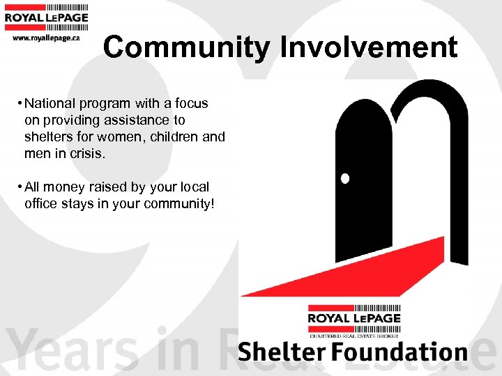 Community Involvement • National program with a focus on providing assistance to shelters for women, children and men in crisis. • All money raised by your local office stays in your community!