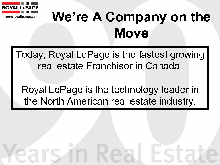 We’re A Company on the Move Today, Royal Le. Page is the fastest growing real estate Franchisor in Canada. Royal Le. Page is the technology leader in the North American real estate industry.
