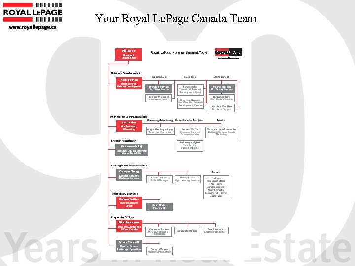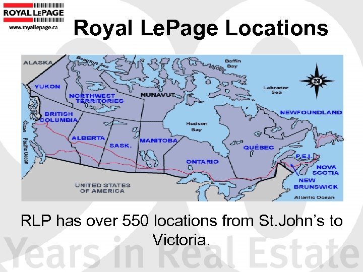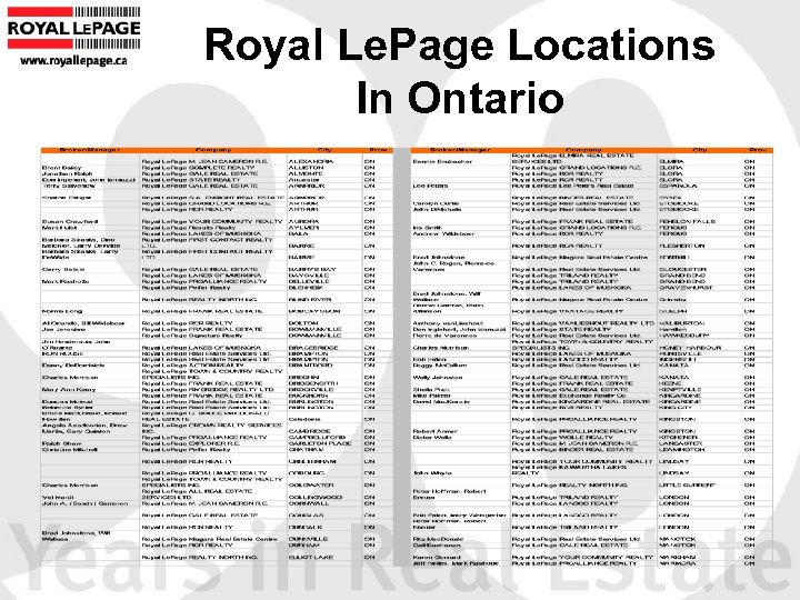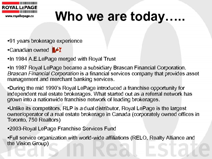 Who we are today…. . • 91 years brokerage experience • Canadian owned • In 1984 A. E. Le. Page merged with Royal Trust • In 1987 Royal Le. Page became a subsidiary Brascan Financial Corporation is a financial services company that provides asset management and merchant banking services. • During the mid 1990’s Royal Le. Page introduced a franchise opportunity for independent real estate brokerages. What started out as a referral network has grown into a nationwide franchise network of leading brokerages. • Unlike its competitors, RLP is a dual distributor, Royal Le. Page is the largest owner/operator of a real estate brokerage in Canada (corporately owned offices in Toronto, 750 Realtors) • 2003 -Royal Le. Page Franchise Services Fund • Full service organization with world-wide affiliations (RELO, Realty Alliance and the Vision Group)