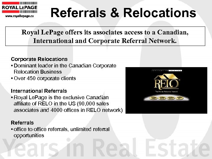 Referrals & Relocations Royal Le. Page offers its associates access to a Canadian, International and Corporate Referral Network. Corporate Relocations • Dominant leader in the Canadian Corporate Relocation Business • Over 450 corporate clients International Referrals • Royal Le. Page is the exclusive Canadian affiliate of RELO in the US (90, 000 sales associates and 4000 offices in RELO network) Referrals • office to office referrals, unlimited referral opportunities