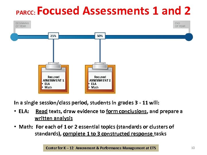 PARCC – Two Types of Summative Assessments FOCUSED ASSESSMENTS END OF YEAR COMPREHENSIVE ASSESSMENT • One to three tasks that assess a few “keystone” standards/topics • Taken on computer, with mixed item types • Given at three points during the school year, near the end of quarters • Scored entirely by computer for fast results • Results within 2 weeks to inform instruction and intervention Scores from both focused & end-of-yr. assessments will be combined for annual accountability score. Center for K – 12 Assessment & Performance Management at ETS 9