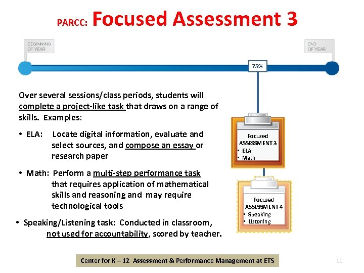 PARCC: Focused Assessments 1 and 2 25% 50% Focused ASSESSMENT 1 • ELA • Math Focused ASSESSMENT 2 • ELA • Math In a single session/class period, students in grades 3 - 11 will: • ELA: Read texts, draw evidence to form conclusions, and prepare a written analysis • Math: For each of 1 or 2 essential topics (standards or clusters of standards), complete 1 to 3 constructed response tasks Center for K – 12 Assessment & Performance Management at ETS 10