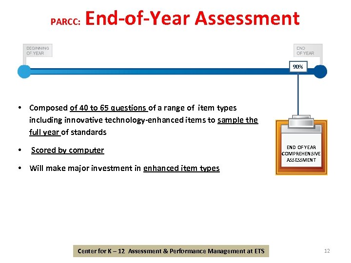PARCC: Focused Assessment 3 75% Over several sessions/class periods, students will complete a project-like task that draws on a range of skills. Examples: • ELA: Locate digital information, evaluate and select sources, and compose an essay or research paper • Math: Perform a multi-step performance task that requires application of mathematical skills and reasoning and may require technological tools • Speaking/Listening task: Conducted in classroom, not used for accountability, scored by teacher. Focused ASSESSMENT 3 • ELA • Math Focused ASSESSMENT 4 • Speaking • Listening Center for K – 12 Assessment & Performance Management at ETS 11