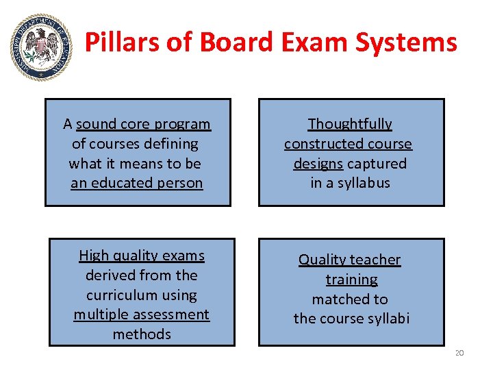Pillars of Board Exam Systems A sound core program of courses defining what it means to be an educated person High quality exams derived from the curriculum using multiple assessment methods Thoughtfully constructed course designs captured in a syllabus Quality teacher training matched to the course syllabi 20