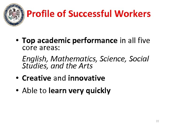 Profile of Successful Workers • Top academic performance in all five core areas: English, Mathematics, Science, Social Studies, and the Arts • Creative and innovative • Able to learn very quickly 22
