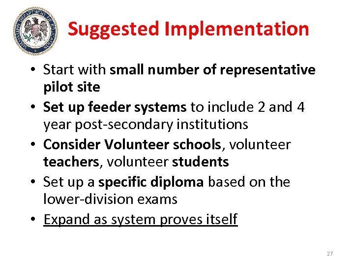 Suggested Implementation • Start with small number of representative pilot site • Set up feeder systems to include 2 and 4 year post-secondary institutions • Consider Volunteer schools, volunteer teachers, volunteer students • Set up a specific diploma based on the lower-division exams • Expand as system proves itself 27