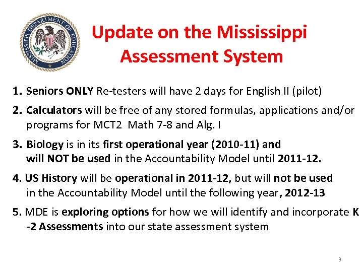 Update on the Mississippi Assessment System 1. Seniors ONLY Re-testers will have 2 days for English II (pilot) 2. Calculators will be free of any stored formulas, applications and/or programs for MCT 2 Math 7 -8 and Alg. I 3. Biology is in its first operational year (2010 -11) and will NOT be used in the Accountability Model until 2011 -12. 4. US History will be operational in 2011 -12, but will not be used in the Accountability Model until the following year, 2012 -13 5. MDE is exploring options for how we will identify and incorporate K -2 Assessments into our state assessment system 3