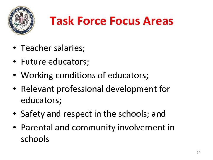 Task Force Focus Areas Teacher salaries; Future educators; Working conditions of educators; Relevant professional development for educators; • Safety and respect in the schools; and • Parental and community involvement in schools • • 34