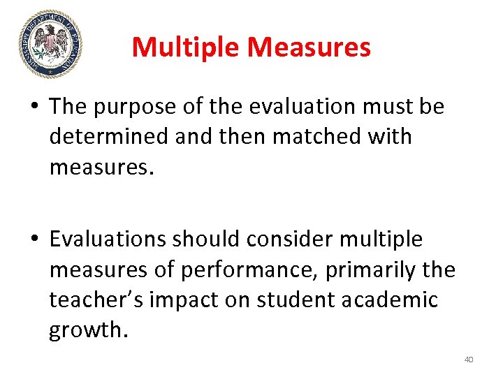 Multiple Measures • The purpose of the evaluation must be determined and then matched with measures. • Evaluations should consider multiple measures of performance, primarily the teacher’s impact on student academic growth. 40