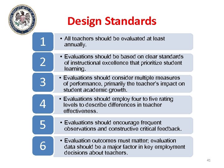 Design Standards 1 • All teachers should be evaluated at least annually. 2 • Evaluations should be based on clear standards of instructional excellence that prioritize student learning. 3 • Evaluations should consider multiple measures of performance, primarily the teacher’s impact on student academic growth. 4 • Evaluations should employ four to five rating levels to describe differences in teacher effectiveness. 5 • Evaluations should encourage frequent observations and constructive critical feedback. 6 • Evaluation outcomes must matter; evaluation data should be a major factor in key employment decisions about teachers. 41
