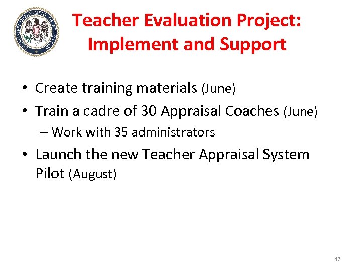 Teacher Evaluation Project: Construct and Connect • • Report progress of development (March) Finalize new instruments (May) Present new system to the State Board (June) Instrument Validation – District participation – Conduct validation study (October - November) 46