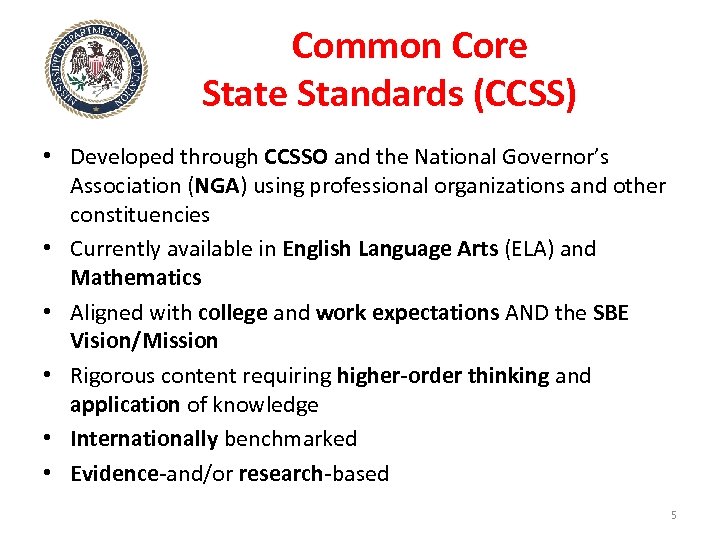 Common Core State Standards (CCSS) • Developed through CCSSO and the National Governor’s Association (NGA) using professional organizations and other constituencies • Currently available in English Language Arts (ELA) and Mathematics • Aligned with college and work expectations AND the SBE Vision/Mission • Rigorous content requiring higher-order thinking and application of knowledge • Internationally benchmarked • Evidence-and/or research-based 5