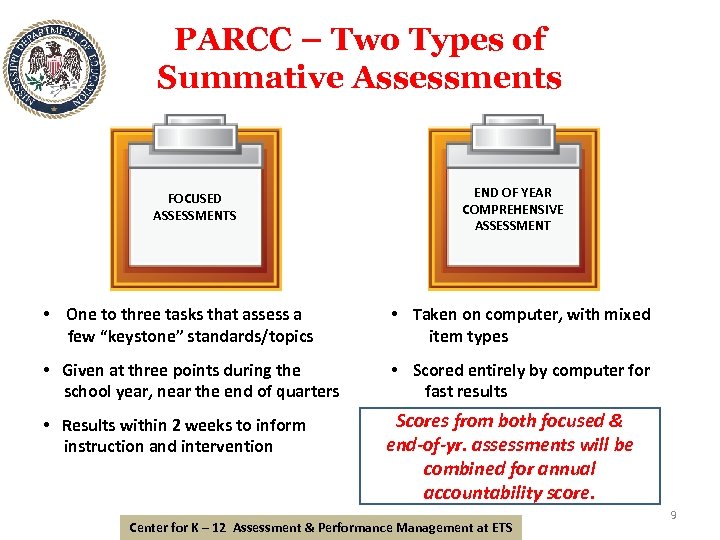 Basic PARCC Timeline 2010 -2011 Development/approval of common policies/procedures 2011 -2012 Initial item /task development, piloting of components 2011 -2012 Development of P. D. resources & online platform 2012 -2013 Field testing 2013 -2014 Field testing 2014 -2015 New summative assessments in use Summer 2015 Setting of common achievement standards Center for K – 12 Assessment & Performance Management at ETS 8