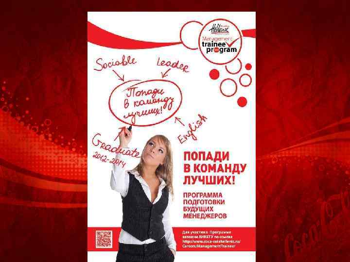 Программа подготовки будущих менеджеров Coca-Cola Hellenic в России предлагает выпускникам и молодым специалистам уникальную возможность прикоснуться к увлекательному миру бизнеса и построить карьеру в международной Компании! Coca-Cola Hellenic в России приглашает талантливых молодых специалистов и выпускников принять участие в Программе подготовки будущих менеджеров - Coca-Cola Hellenic Management Trainee Program. Участники программы получат возможность пройти путь от выпускников вузов до линейных руководителей в международной компании всего за 2 года!