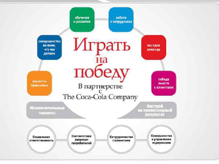Играем на победу Стратегия «Играть на победу 2020» основывается на наших ключевых ценностях и четырех стратегических принципах: Соответствие запросам потребителей, Сотрудничество с клиентами, Социальная ответственность Совершенство в управлении издержками. Мы «Играем на победу» в партнерстве с The Coca. Cola Company, нашим партнером по развитию бизнеса. Исключительные таланты и настрой на превосходный результат – вот то основное, что позволяет нам достигать наших амбициозных целей.
