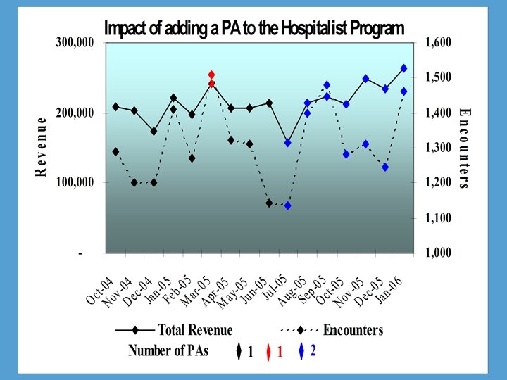 Integrated Hospitalist Teams: Advantages of PAs and NPs Ø Cost less than M. D. F. T. E. Ø Manage the care of patients not requiring direct physician care time Ø Provide high-quality care Ø Facilitate and coordinate care processes Ø Enhance efficiency Ø Augment practice productivity Ø Serve most specialties Ø Perform procedures Economics 1990 Beck LC, Medical