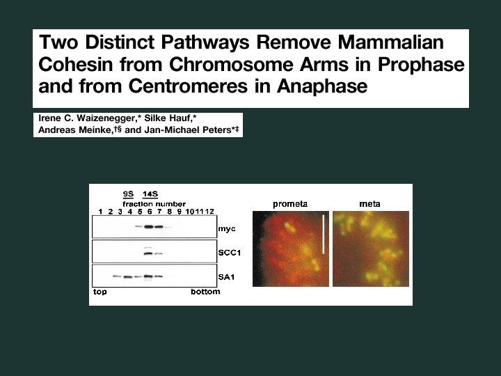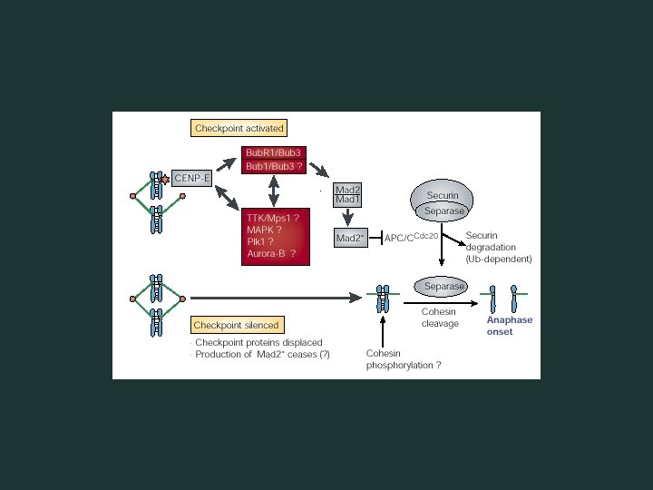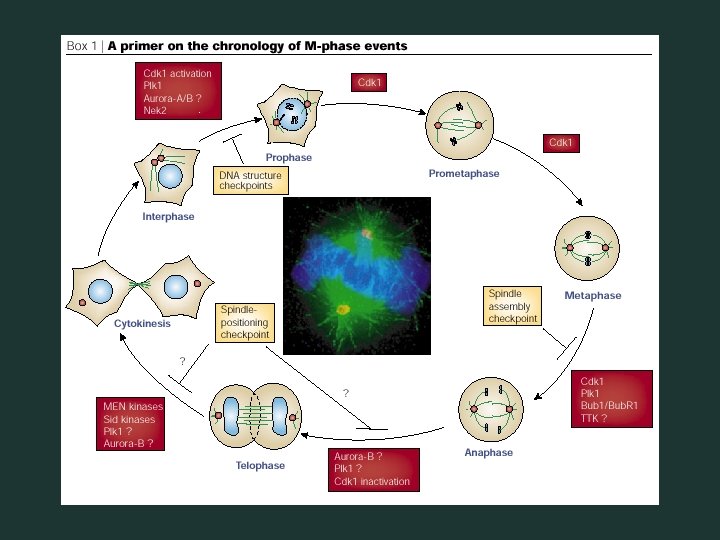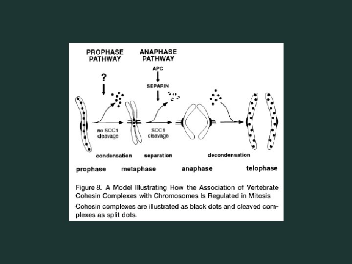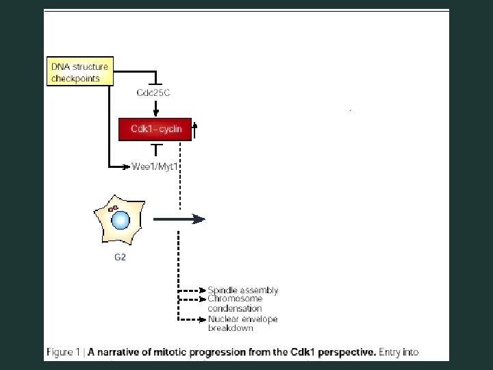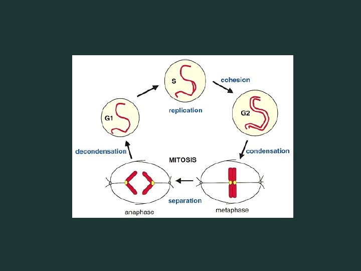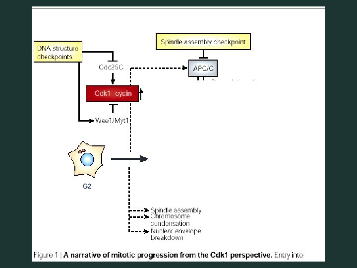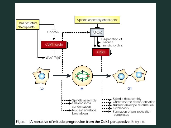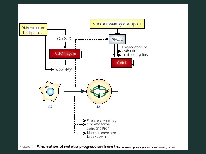 Mitotic events - early • • • Import of cyclin B 1 -cdk 1. Disassembly of the nuclear lamina. Chromosome condensation. Dissociation of cohesins from chromatid arms. Separation of centrosomes and assembly of the mitotic spindle. • Bipolar attachment of the spindle to the chromosomes. • Release of the mitotic checkpoint.