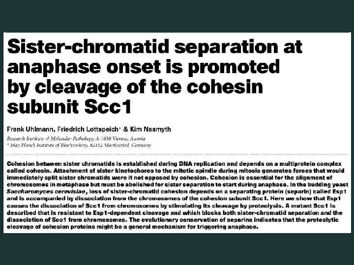 The three factors that enable sister chromatid separation • The pulling force - the mitotic spindle • The glue - cohesins • The timing mechanism - spindle checkpoint