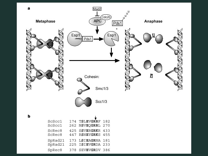Sister chromatid separation from prometaphase to anaphase Check APC Separin point Securin Separin Cohesin prometaphase Cohesin metaphase Securin anaphase