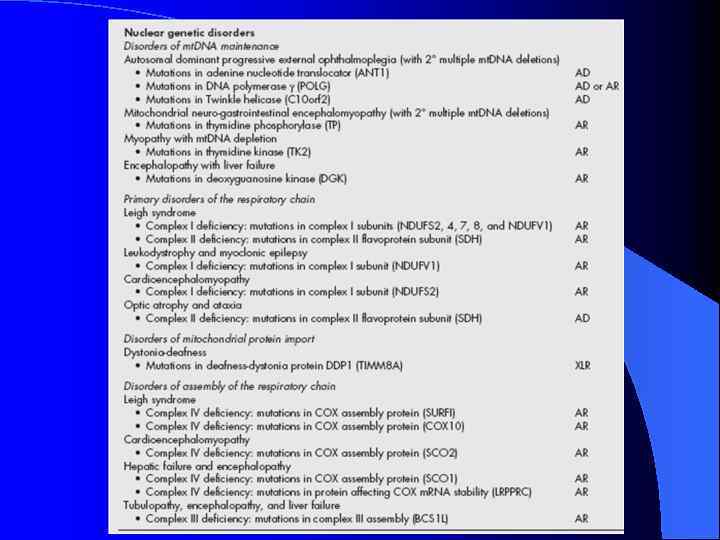 Классификация митоходриальных болезней l l Обусловленные мутациями мт. ДНК Точковые мутации (синдромы LHON, NARP, Ли, MERRF, MELAS, ММС) Крупные перестройки (синдромы КSS, CPEO, Пирсона) Обусловленные мутациями я. ДНК Мутации генов, кодирующих КДЦМ и белки, необходимые для их сборки (синдром Ли) Мутации ядерных генов, вызывающих мутации в мт. ДНК (синдром СPEO/СPEO , болезнь Альперса)