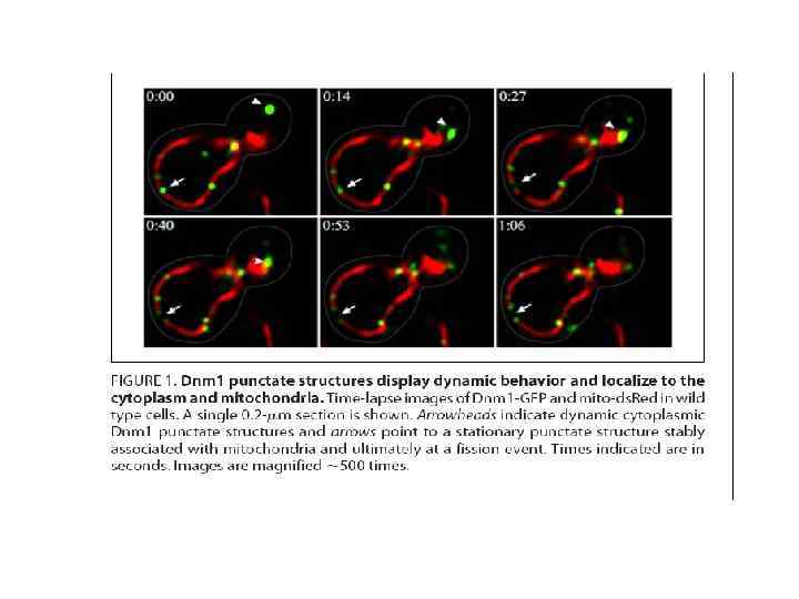 • Основными регуляторами слияния митохондрий у дрожжей являются ГТФазы наружной и внутренней мембран митохондрий Fzo 1 и Mgm 1 соответственно, а также белок наружной мембраны Ugo 1 • Процесс слияния митохондрий имеет большое значение для наследования и сохранения генома митохондрий. Не случайно перед митозом или мейозом ядра происходит слияние мелких митохондрий в одну или несколько крупных митохондрий.