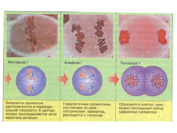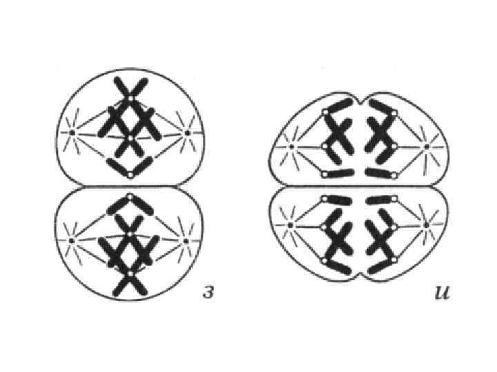 Анафаза 1. В результате этой фазы мейоза происходит разделение хромосом на два гаплоидных набора, попадающих в дочерние клетки. Причем в отличие от мейоза расходятся не хроматиды, а целые хромосомы. Генетическая характеристика клетки - 2 n 4 c (в целом), на полюсах - по n 2 c. Телофаза 1. Хромосомы разошлись к противоположным полюсам. Число хромосом становиться гаплоидным. Хромосомы состоят из двух хроматид. Вследствие кроссинговера хроматиды неоднородны. На короткое время образуется кариолемма. Хромосомы не деспирализуются. Далее происходит деление цитоплазмы, аналогичное тому, что наблюдается при митозе. Генетическая характеристика образовавшихся клеток n 2 c.