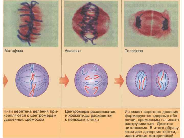На хромосомах появляется перетяжка – центромера – к ней прикрепляются нити веретена деления. Каждая хромосома состоит из двух свернутых спиральных нитей - хроматид, тесно прилегающих друг к другу. На концах хромосом располагается специальный концевой участок ДНК – теломера. Теломера защищает хромосому от слияния с другими хромосомами. Метафазная хромосома 1 – сестринские хромосомы (хроматиды); 2 – плечи хромосом; 3 – центромера; 4 – вторичная перетяжка – ядрышковый организатор; 5 – теломеры; 6 – пучки микротрубочек.