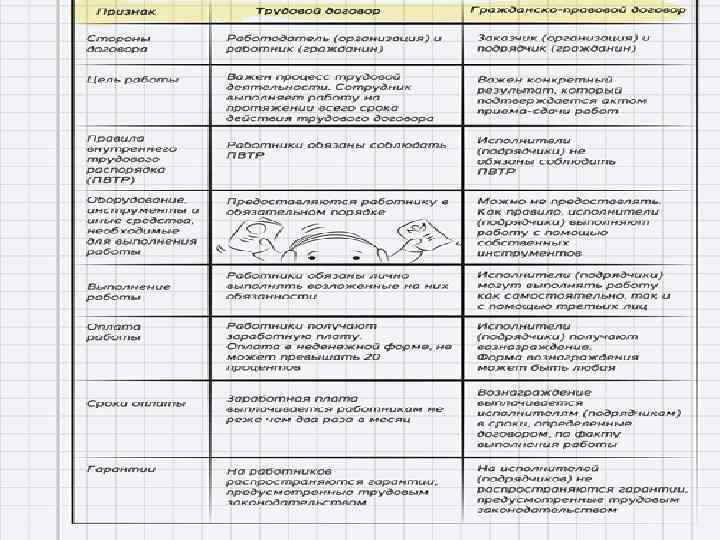 ПРАКТИКА Чтобы было понятнее, о чем речь, вот простой пример. Мне, директору компании нужно привести в порядок территорию - клумбу разбить, деревья посадить. Я могу взять в штат садовника, а то и ландшафтного дизайнера. Он будет выходить на службу каждый день с девяти до шести, сажать любимые мной розы, но в зимний сезон делать ему будет нечего. Но можно договориться с ним о договоре подряда (это уже гражданско-правовые отношения) на выполнение конкретной работы за конкретное время. В штат фирмы он не войдет, своим рабочим временем будет распоряжаться самостоятельно, а плату получит за конечный результат - цветущие кусты и клумбы. Плюсы от такого оформления взаимоотношений есть у обеих сторон. Компании такой работник обходится дешевле, ведь за него не надо платить соцвзносы. Работник, в свою очередь, чувствует себя свободнее, он не привязан к конкретному рабочему месту. Но - и это уже минус - за такую свободу ему приходится "расплачиваться" отсутствием социальных гарантий.