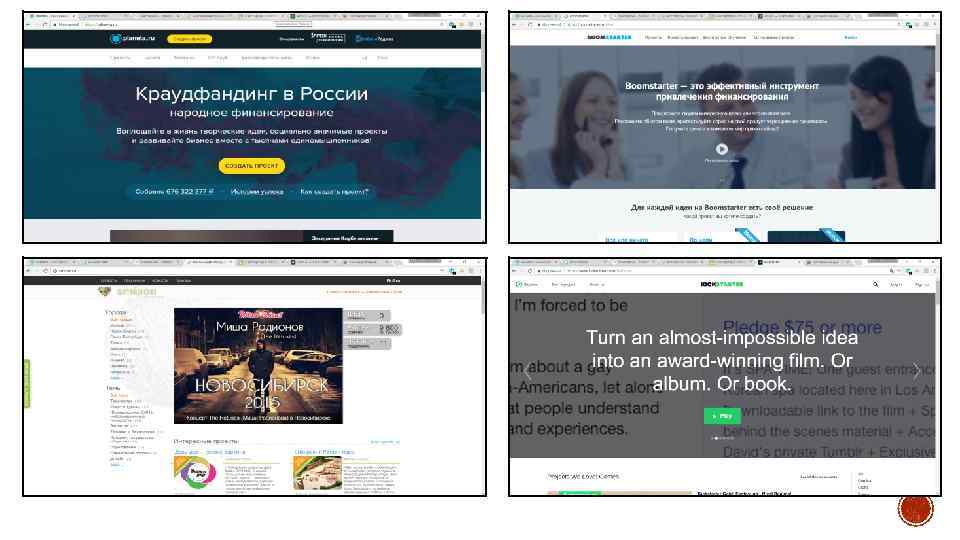 КРАУДФАНДИНГОВЫЕ ПЛАТФОРМЫ: § https: //www. kickstarter. com - США, преимущественно творческие стартапы § http: //crowdpublishing. ru/ - РФ § https: //boomstarter. ru/ - самая популярная в РФ § https: //planeta. ru/ - для творческих проектов и лидер по сумме крауд-сборов в РФ § http: //smipon. ru/ - бизнес, творчество, образование, экология § http: //nachinanie. ru/ - для проектов ДФО в рамках программы « В добром крае, добрые дела при участии РПЦ и «Деловой России»