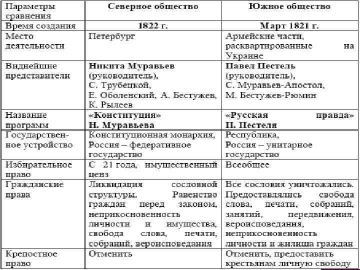 Северное общество, 1822– 1825 гг. , Петербург Н. М. Муравьев, С. П. Трубецкой, Н. И. Тургенев, Е. П. Оболенский, М. С. Лунин, И. И. Пущин, К. Ф. Рылеев и др. "Конституция" Н. М. Муравьева. Ликвидация самодержавия и сословий, равенство граждан перед законом, гражданские свободы. Отмена крепостного права. Установление конституционной монархии. Законодательная власть – двухпалатный парламент, исполнительная – император. Избирательное право ограничено имущественным цензом. Сохранение помещичьей собственности на землю