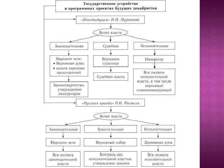 1821 – 1825 гг. , Тульчин (Украина) П. И. Пестель, А. П. Юшневский, И. Г. Бурцов и др. "Русская правда" П. И. Пестеля. Установление республики. Законодательная власть – однопалатный парламент, исполнительная – Державная дума из пяти членов, избирающихся на пять лет. Ежегодно один из них становится президентом республики. Полное уничтожение крепостного права. Неограниченное избирательное право. Равенство всех граждан перед законом. Деление земли на две части: общественную и частную. Получение крестьянами наделов из общественной земли