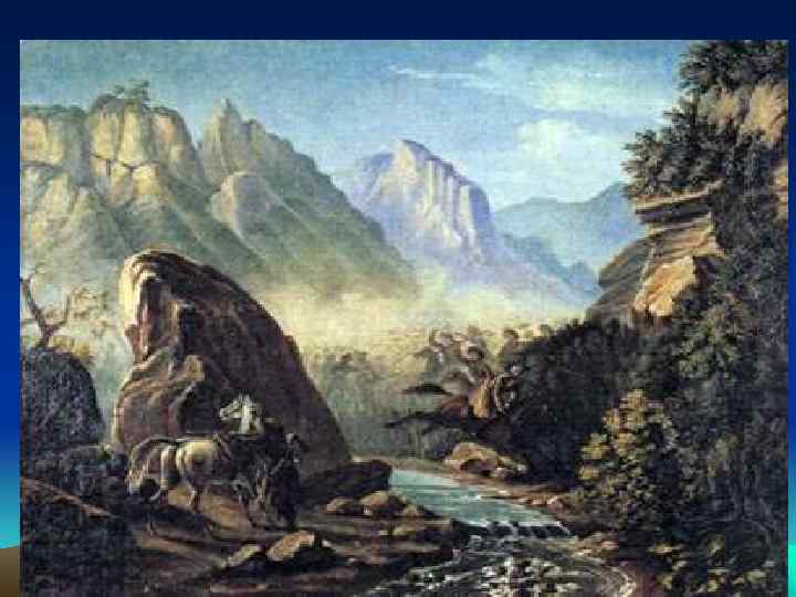 • Также одной из картин на военную тему является полотно "Перестрелка в горах Дагестана". Здесь Лермонтов средствами живописи сумел показать суровую обстановку военной жизни и утомительный бой русских с черкесами.