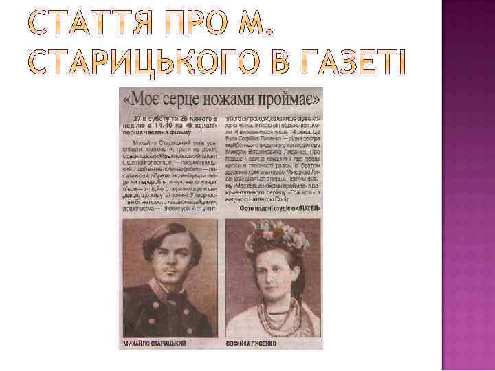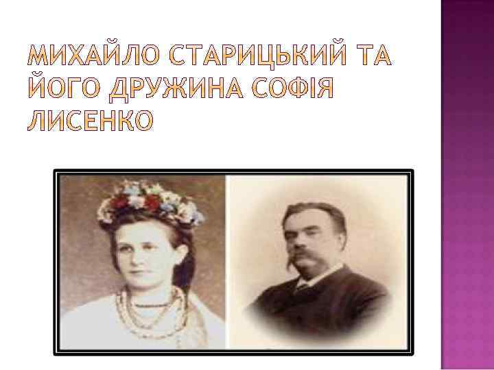 Кабінет Михайла Старицького у меморіальному будинку-музеї в Києві М. Старицький - студент М. Садовський у ролі Богдана Хмельницького з п'єси М. Стариць кого «Богдан Хмельницький» Старицька Черняхівська Вероніка Черняхівська . М. Старицький і М. Кропивницький М. Старицький із дружиною