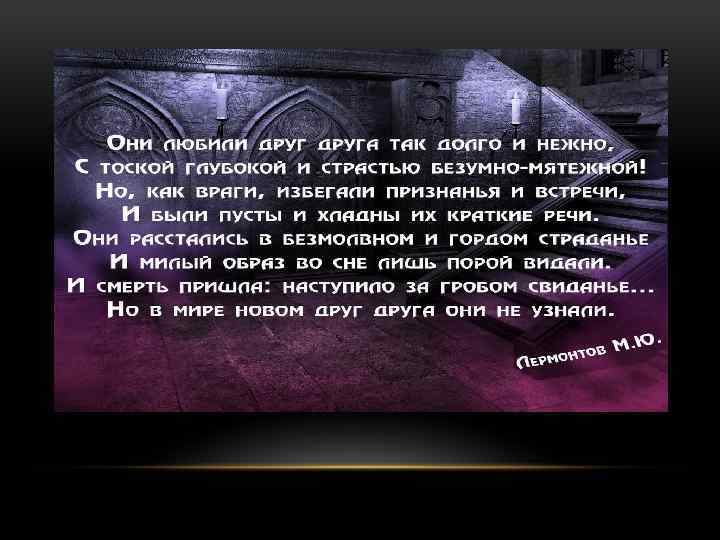 1 місце «Смерть поета» Вірш є відгуком на смерть А. С. Пушкіна; написано в 1837 році. Вірш «Смерть поета» займає в історії вітчизняної літератури особливе місце: це найбільш рання за часом і незрівнянна за поетичною силі узагальнююча оцінка історичного, всенародного значення Пушкіна. Вірш мало широкий громадський резонанс. Дуель і смерть Пушкіна, наклеп і інтриги проти поета в колах придворної аристократії викликали глибоке обурення серед передової частини російського суспільства. Лермонтов висловив ці настрої в мужніх, виконаних поетичної сили віршах, які розійшлися в багатьох списків серед сучасників. Однак, в придворних колах вірш було розцінено як «безсоромне вільнодумство, більш ніж злочинне» . На Лермонтова було заведено справу «Про недозволенних віршах. . . » ; в середині лютого 1837 він був заарештований, а вже 25 -го стало відомо рішення Миколи I перевести Лермонтова «тим же чином у Нижегородський драгунський полк» (посилання